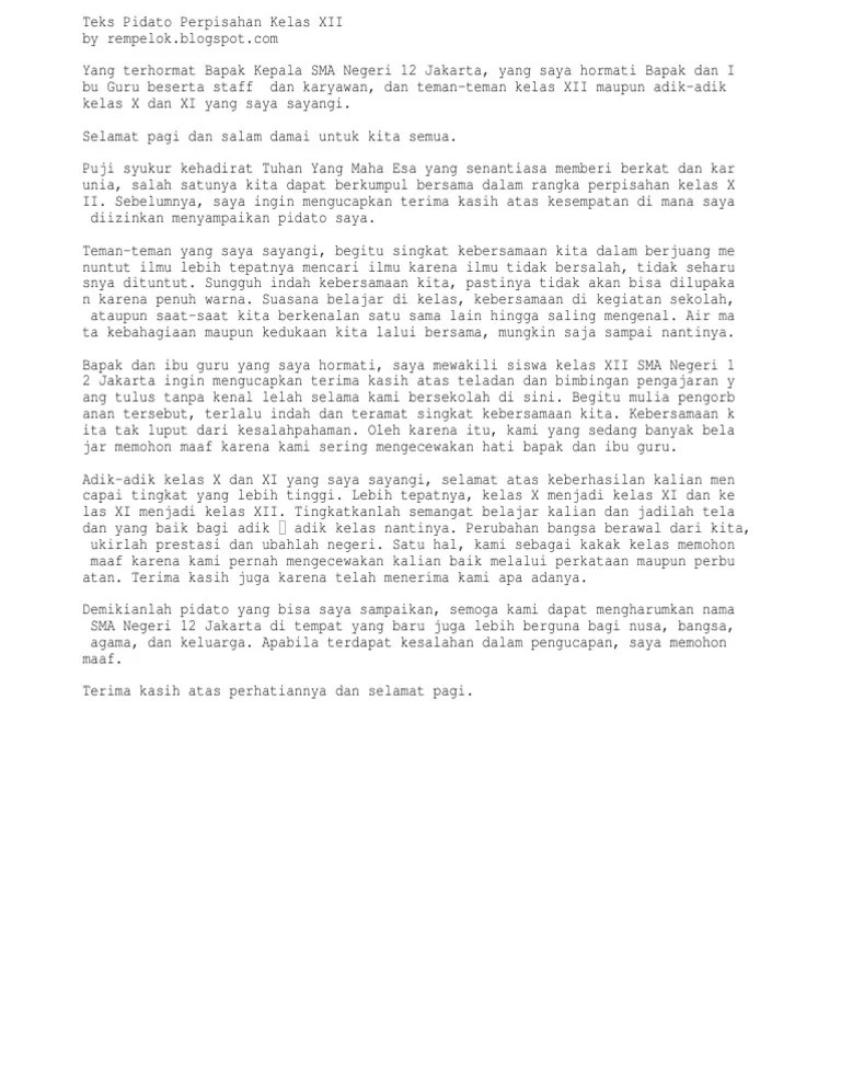 Contoh teks pidato perpisahan sekolah singkat kelas 6 sd 9 smp 12 sma. Kepala sekolah sma negeri 176, jakarta, bapak dan ibu guru, staff tata usaha, serta para tamu undangan. Pidato bahasa jawa pidato perpisahan kelas sanga. Nah pada kesempatan ini saya akan memberikan contoh pidato perpisahan singkat untuk kelas 12 sma/smk. Di bawah ini contoh pidato perpisahan sma kelas 12 yang singkat, padat dan jelas serta sesuai ejaan dan kaidah berbahasa indonesia yang .